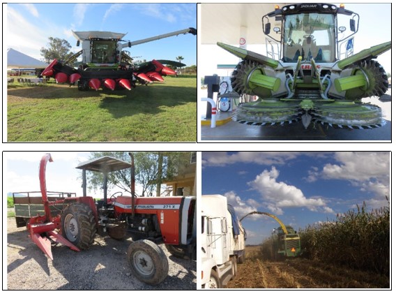 Trilladora nueva (arriba izquierda). Picadora de forraje para ensilado (arriba derecha) Picadora de un surco para verde picado (abajo izquierda) Corte de forraje para fletear a otra zona geográfica (abajo derecha).