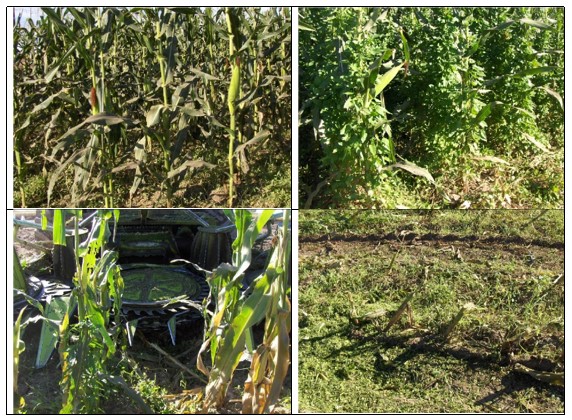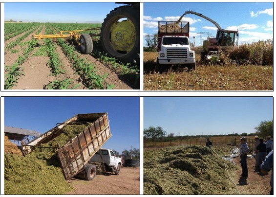 Cultivador de maleza en surcos (arriba izquierda) Corte de maíz para ensilado (arriba derecha) Elaboración del silo de maíz (abajo izquierda) Acondicionamiento de aditivos previo a la compactación (abajo derecha)