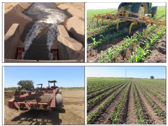 La disponibilidad de agua en el distritito de riego, cada año se define la superficie de siembra en 5,000 a 70,000 hectáreas de maíz (arriba izquierda) El manejo integral de plagas y malezas permite la sostenibilidad del cultivo (arriba derecha) La aplicación de compostas mejora la estructura del suelo y alimenta la flora y fauna del subsuelo (abajo izquierda) Un cultivo bien trabajado reduce el riesgo de heladas y da certeza en los rendimientos (abajo derecha).