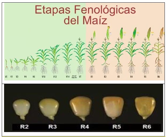 V vegetativo, R estado reproductivo, VE estado de emergencia vegetativa casi 100 GDD, V3 llega a 275 grados de crecimiento, V12 ya están presentes las hojas expandidas 870 GDD, V15 está el total de las hojas y todos los óvulos completos en la mazorca principal, VT emergencia de la espiga, VT/R1 es dependiente de cada híbrido 1,100 a 1,400 GDD, R1 emergencia del jilote o barba es la inflorescencia femenina del maíz, R2 la mazorca está completa y crecida. Con estrés por falta de agua se abortan los óvulos de la punta del elote.