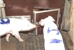 La Dra. Liza R. Moscovice (FBN) y su colaborador, el Prof. Jean-Loup Rault (Universidad de Medicina Veterinaria) han desarrollado una forma novedosa de estudiar el comportamiento de ayuda en el que se pueden probar los cerdos en sus grupos sociales normales dentro de su entorno habitual de establo. En el corral de los cerdos hay dos compartimentos idénticos. Cada compartimento tiene una ventana y una puerta, que sólo se pueden abrir desde el exterior, levantando una manija lo suficientemente alto como para soltar un pestillo.
