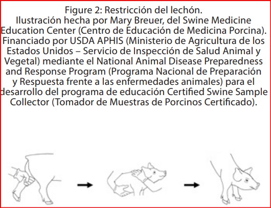Las restricciones empáticas son un mecanismo popular que se usa para realizar distintas actividades, tales como el sangrado, la vacunación, la administración de eutanasia, etc. Hay distintas maneras de restringir a un cerdo dependiendo de su tamaño. Se restringe a los lechones al levantarlos agarrándolos de la pata trasera por encima del corvejón y llevándolos frente al pecho de la persona, tal como se muestra en la Figura 2. No hay que levantarlos de las orejas, cabezas, colas o patas delanteras, y hay que evitar balancear al cerdo en el aire. Cuando se libera al cerdo en el corral, es necesario asegurarse de que haya dos puntos de contacto antes de soltarlo, por ejemplo, que ambas patas delanteras estén en contacto con el piso.