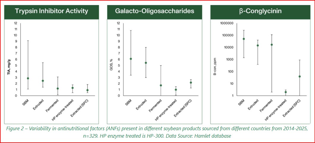 Cuando se incluye harina de soya (SBM) en las dietas, se debe considerar la importante variabilidad en su composición al formular el alimento. Esto es particularmente importante porque los ANF presentes en la SBM y otros productos de soya procesados reducen la digestibilidad general, causan daño intestinal, estrés oxidativo, inflamación y posiblemente diarrea.