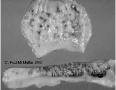 • Necrotic plaques in proventriculus, intestine, caecal tonsil.