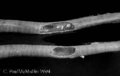 Figure 30. Severe tracheitis is broilers with respiratory disease complex. Both tracheas were congested and the upper sample had mucopurulent material in the lumen.