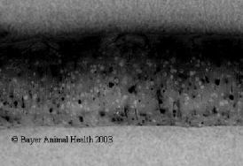 | Figure 14. Moderate Eimeria necatrix infection in the jejunum of a chicken (Score 3). In this case the intestine is thickened and can become ballooned and sausage-like. Haemorrhages and white spots are visible from the outside of the intestine. |