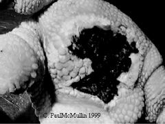 • Blackened skin progressing to erosions and fibrosis on the lower surface of the foot pad, at the back of the hocks, and sometimes in the breast area. If severe the foot and hock lesions may contribute to lameness or serve as a portal of entry for secondary infections.