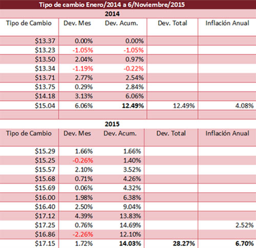 Al día de hoy el tipo de cambio a la venta del Peso Mexicano: Dólar cerró a $17.15 Mx. El Banco de México no hizo ningún movimiento en ajuste a las tasas de interés. El peso mexicano ha tenido una devaluación durante 2014 y 2015 con respecto al dólar americano del 28.27%, mientras que la inflación acumulada durante este mismo periodo ha sido de tan sólo el 6.7%, existiendo una disparidad de más casi 22 puntos porcentuales entre inflación y devaluación (Ver cuadro) y no se sabe a ciencia cierta cuales podrán ser los efectos de “rebote” en la economía nacional y sobre todo en el sector de la industria porcina. La tendencia y los indicativos macroeconómicos continúan estimando que el peso mexicano cerrará el año por debajo de los $17.00 Mx: $1.00 USD. ¿Lo creé Ud.?