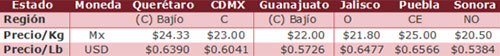 En el cuadro anterior se observa una diferencia de $4.50 Mx por Kilogramo entre el precio más alto (Puebla) y el más bajo (Sonora) de los reportados en este cuadro o $0.1182 USD por libra de peso.