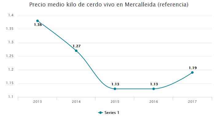Esta concentración de los cerdos y el aumento de la producción se han encontrado con otras circunstancias, a nivel de precios. 2017 ha empezado con un ligero repunte en el género vivo, en torno a 1,19€ el precio por kilo (de clase E). Este repunte está aún lejos del precio medio de 2013, de 1,38€, desde el que el sector ha experimentado una caída continuada. El aumento de la oferta en el mercado comunitario, según el Ministerio de Agricultura, Ganadería y Pesca, ha sido uno de los responsables de la bajada.