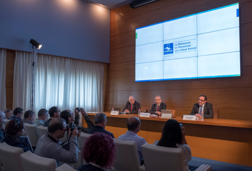 ESPAÑA - Hipra ofreció el jueves 27 de abril en sus instalaciones centrales de Amer (Girona) una rueda de prensa, que contó con la presencia de los Directores Generales de Hipra e Hipra España, y con el Director de Marketing de la compañía. La finalidad fue presentar al sector la visión de Hipra y su objetivo de ser líderes a nivel mundial no sólo en vacunas sino en prevención, incluyendo también su trabajo en desarrollo de adyuvantes, modelos de diagnóstico y equipos de vacunación.
