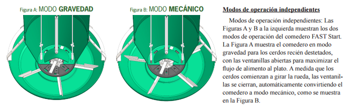 Cuando los lechones destetados son colocados en el comedero, unas pequeñas ventanillas se abren en el fondo de la tolva, permitiendo el flujo libre de alimento al plato. A medida que los cerdos crecen, comienzan a girar la rueda en el fondo del plato, lo que cierra las ventanillas del fondo de la tolva.