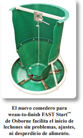 El Presidente y CEO de Osborne, Sr. George Eakin, dice, “El comedero FAST Start es la respuesta al Viejo problema de diseñar un comedero capaz de alimentar lechones muy nuevos y, a la vez, evitar el desperdicio de alimento que ocurre cuando los cerdos crecen. Los comederos tradicionales de flujo por gravedad son fáciles de usar para los lechones nuevos, pero los ajustes para evitar el desperdicio a medida que los cerdos crecen, se transforman en una pesadilla.”