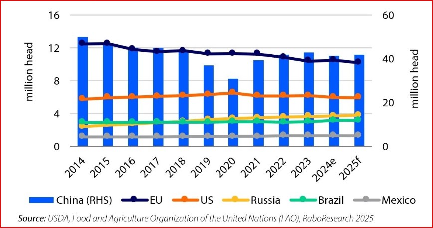 A pesar de las ganancias positivas en 2024, la expansión de los hatos sigue siendo lenta, con ligeros aumentos de producción en China, Brasil, y México, y con disminuciones en la UE y los EE. UU. La rentabilidad sostenida será crucial para atraer inversiones en 2025.