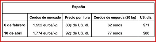 - La semana pasada, el precio en efectivo para lechones destetados temprano en Estados Unidos fue de $44.15 US. dls.; hace un año, la misma semana, fue de $45.38 US. dls. No hace mucho costaban más de $80 US. dls. La semana pasada, por primera vez desde que tenemos memoria, el Departamento de Agricultura de Estados Unidos (USDA, por sus siglas en inglés) no publicó un precio de cerdo de engorde de 40 libras. El USDA dijo que "los cerdos de engorde no se comercializan".