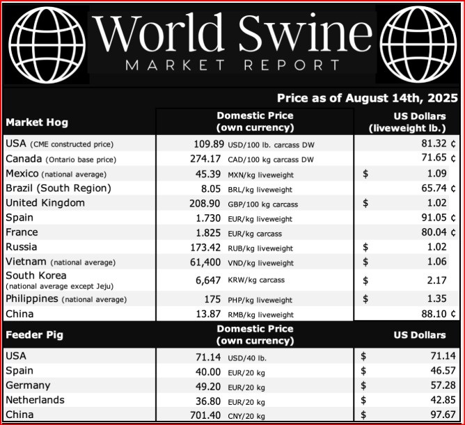 15 August 2025REINO UNIDO - El mercado porcino del Reino Unido (UK) se mantiene estable, con los productores aún obteniendo rentabilidad. El precio promedio en pie es de 1,02 USD/lb, lo que deja margen para ganancias. El sacrificio de cerdos en el Reino Unido la semana pasada totalizó 159.000 cabezas, prácticamente la misma cifra que en la misma semana del año pasado. El mercado porcino del Reino Unido (UK) se mantiene estable, con los productores aún obteniendo rentabilidad. El precio promedio en pie es de 1,02 USD/lb, lo que deja margen para ganancias. El sacrificio de cerdos en el Reino Unido la semana pasada totalizó 159.000 cabezas, prácticamente la misma cifra que en la misma semana del año pasado. En lo que va de 2025, el sacrificio acumula un 3 % menos que en 2024. El peso medio de la canal subió a 88,5 kg (195 lbs.), ligeramente por encima del mes pasado.