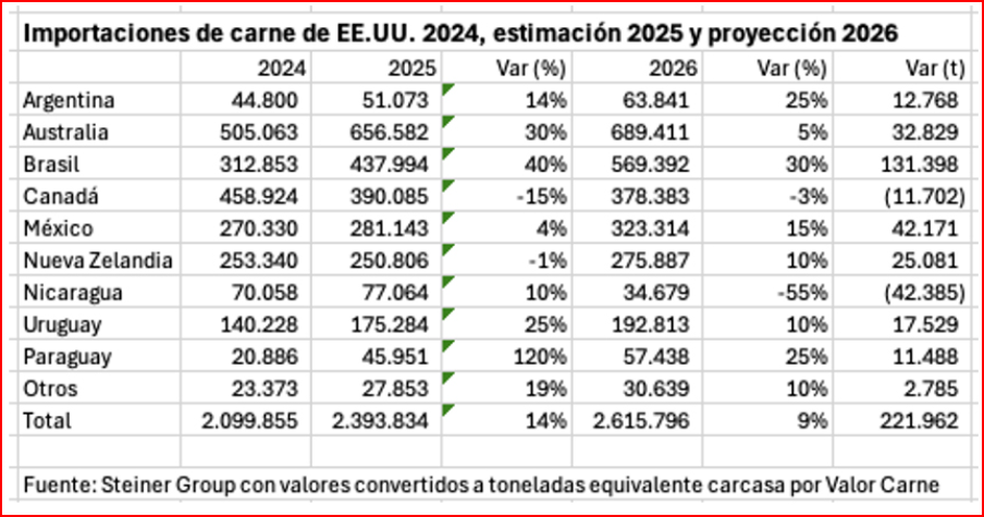 15 December 2025EUA - Steiner Group, una reconocida consultora, prevé que en 2026 las compras norteamericanas de carne vacuna crecerán 9%. Brasil sacaría el mayor provecho, ya los sobre aranceles del 40%. La Argentina sería el séptimo proveedor, sin contemplar la ampliación de la cuota que se está negociando. Las importaciones por país en toneladas son equivalentes a carcasa.