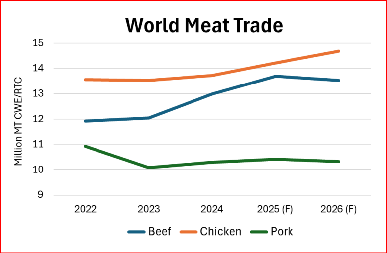 Comercio mundial de carne en 2026: la carne de vacuno y de cerdo se estancan, mientras que la de pollo continúa en ascenso