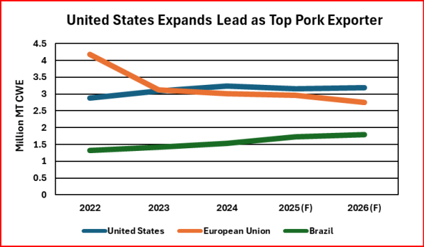 Se prevé que la producción de carne de cerdo en Estados Unidos en 2026 se mantenga prácticamente sin cambios, en 12,5 millones de toneladas, ya que el mayor peso de los cerdos compensará en gran medida la menor cantidad de sacrificios, como consecuencia de la disminución prevista de los partos en 2026. A pesar de la mejora de la rentabilidad del sector en 2025, la presión de las enfermedades obstaculizó en ocasiones el crecimiento de la producción. Se prevé que las exportaciones estadounidenses aumenten un 1% en 2026, hasta alcanzar los 3,2 millones de toneladas, gracias a la estabilidad de la oferta interna, la fuerte competitividad de los precios de exportación y la sólida demanda de Centroamérica. Además, se espera que un acuerdo reciente con Malasia genere mayores oportunidades de exportación de carne de cerdo.