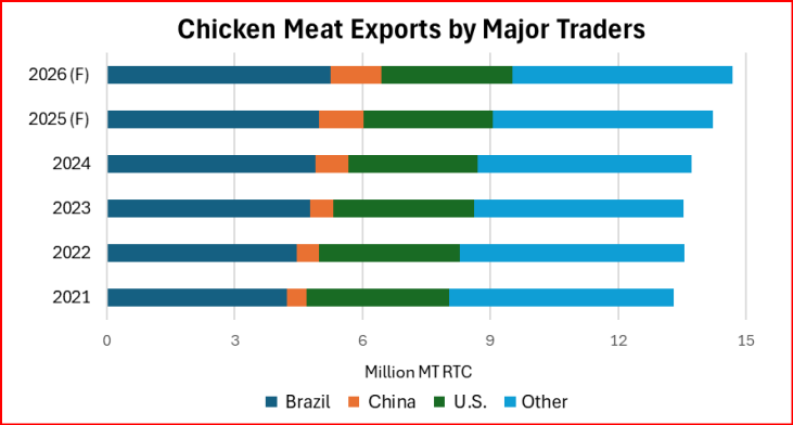 Se pronostica que las exportaciones mundiales aumentarán un 3% en 2026, lo que supone el tercer año consecutivo de crecimiento del comercio debido a la creciente demanda de proteína animal a precios más bajos y al crecimiento demográfico. Sin embargo, la expansión global se atribuye en gran medida al aumento de los envíos de Brasil y China. La oferta de productos brasileños, sus precios competitivos y el acceso a los mercados permiten el crecimiento en los principales mercados de importación.