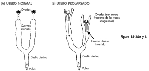 Esta complicación se produce 2 a 3 horas después del parto. El útero se evierte parcial o completamente y protruye desde la vulva como una masa grande (figs. l 5-25A y 15-25B).