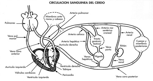 El revestimiento interno del corazón está cubierto por un tejido liso brillante llamado endocardio. La frecuencia de contracción cardíaca se conoce como pulso. Este puede sentirse tanto en la base de la oreja como debajo de la cola y varía entre 200 latidos por minuto en un lechón joven hasta 70 en un adulto.