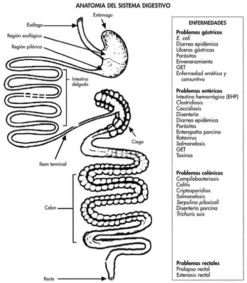 - Hemorragia intestinal (enteropatía hemorrágica porcina, toxina fúngica, infección intestinal aguda asociada con infección por E. coli de los lechones, infecciones por salmonelas o disentería porcina).