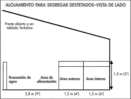 - Discuta con su veterinario el perfil de enfermedades de la granja. Frente abierto o entablado Yorkshire Es posible eliminar de la granja de reproductoras las siguientes enfermedades. Evacuación de Area de Area externa agua alimentación 1,5 m (5') Areaintema Sarna - por medicación (véase cap. 11 ). Rinitis atrófica - por vacunación de la cerda después de un período de 6 meses. Pleuroneumonía grave - previniendo la difusión por aerosoles y vacunando y medicando la granja de cerdas. Disentería porcina - por medicación (véase cap. 9).