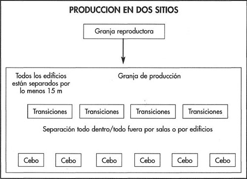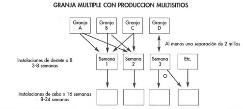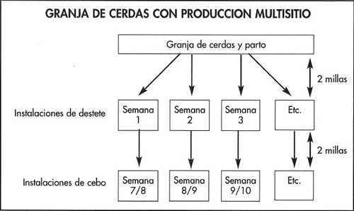 La producción multisitio y modificaciones de ésta se aplicaron con éxito y a gran escala en los EE.UU., México y Chile y está comenzando ahora en el Reino Unido y España. Tiene la gran ventaja de la combinación de la producción todo dentro/ todo fuera por sitio con aquellas del destete segregado. Idealmente se requieren 45.000 cerdas en el primer sitio combinado si las cerdas son tratadas de forma separada o 24.000 cerdas si no lo son, pero puede lograrse un sistema efectivo con menor número de ani- males. El desarrollo de las granjas con cerdas al aire libre proporciona una base ideal para la producción multisitio.