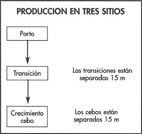 Aquí, como el nombre lo indica, e.1 sistema está dividido en tres fases: reproducción, transición y cebo. El último sitio puede estar adaptado con separaciones de los alojamientos para pern;iitir un sistema todo dentro/todo fuera semanal.