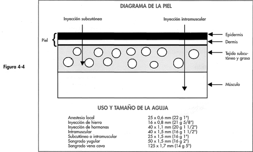 Para una correcta aplicación de los fármacos un conocimiento de la anatomía básica de la piel y delas estructuras subyacentes puede servir como ayuda. La capa más externa de la piel se denomina epidermis o superficie, debajo de la cual hay una capa más gruesa llamada dermis formada por células vivas que se están multiplicando (fig. 4-4). La piel está fijada al músculo subyacente por la combinación de grasa subcutánea y el tejido "conectivo" fibroso. Una inyección directa en la piel o en la dermis (intradérmica) requiere una aguja pequeña de menos de 5 mm de longitud. Esta se utiliza cuando se trata de valorar animales frente a la tuberculosis. La grasa en sí misma tiene un pobre aporte de sangre y una inyección dentro de la grasa tiene mala absorción y por tanto es más probable que se desarrollen abscesos. Las inyecciones subcutáneas sólo deben usarse cuando hay una mínima cantidad de grasa.