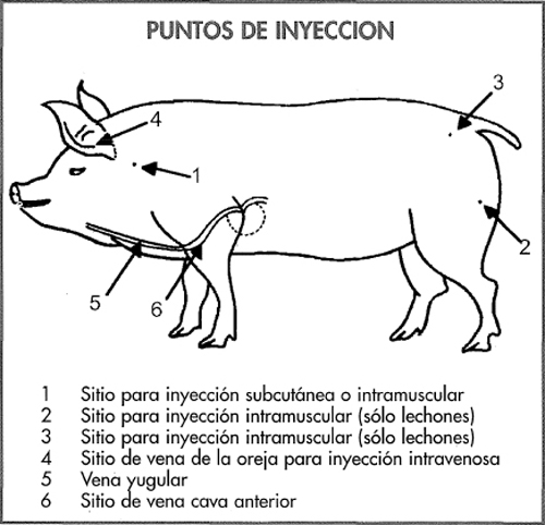- Intramuscular - El sitio de preferencia común en los cerdos destetados, de crecimiento, cebo y adultos es a unos 70 mm detrás de la base de la oreja. Los lechones pequeños con frecuencia se inyectan en el jamón del miembro posterior