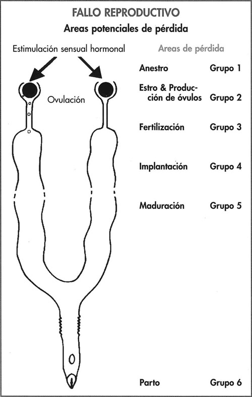 Véase otra vez la figura 5-14 para fijar las áreas de fallos de fertilidad. Las pérdidas del grupo 2 están relacionadas con la disminución de producción de óvulos. Si hay un fallo aquí, las consecuencias serán camadas de pequeño tamaño, variación en el tamaño de las camadas (un aumento en las camadas con un total de nacidos menor de 9) o una posible disminución en la tasa de partos como resultado de una insuficiente cantidad de embriones para el mantenimiento de la gestación . Use los registros de la granja para identificar el grupo de pérdida refiriéndose a los factores enunciados en la figura 5-18. Esto luego indicará qué grupo o grupos están involucrados.