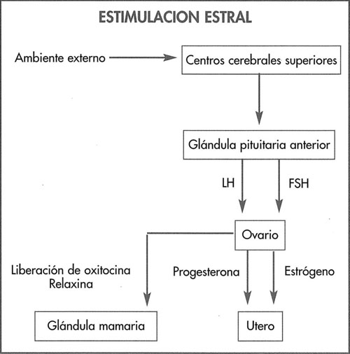 Algunos factores externos estimulan los centros superiores del cerebro que activan la glándula pituitaria (fig. 5-15). Esta pequeña glándula situada en la base del cerebro produce las hormonas que estimulan el ciclo estral (la onda hormonal). Principalmente existen dos hormonas: la foliculoestimulante (FSH), responsable de la estimulación ovárica así como de la formación de los folículos en cuyo interior están los óvulos. La segunda es la luteinizante (LH) que se libera en el momento del estro en la circulación sanguínea para actuar en el folículo y producir la liberación del óvulo. El folículo en desarrollo en el momento del estro tiene un tamaño aproximado al de una cereza pequeña. Puede haber hasta 15 o 18 folículos en cada ovario. Después de que el óvulo es liberado del folículo y ovario, el tejido remanente evoluciona hacia una estructura llamada cuerpo lúteo, responsable de producir la hormona llamada progesterona y cuyos niveles en sangre aumentan a medida que el estro va terminando. Los cambios hormonales se ilustran en la figura 5-16.