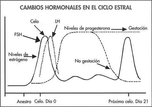 El celo es iniciado por el ovario y se produce otro tipo de hormonas denomina das estrógenos responsables de la aparición de los signos externos de celo. Después de la ovulación, los niveles de estrógenos disminuyen a medida que los de progesterona aumentan. Las hembras con altos niveles de progesterona en los primeros 3 días tras la cubrición probablemente sean más fértiles ya que se crea un ambiente uterino más favorable para el óvulo fertilizado. Cuando se produce un gran consumo de pienso en los 2 a 3 primeros días tras la cubrición pueden disminuir los niveles de progesterona y resultar en un aumento de la mortalidad embrionaria.