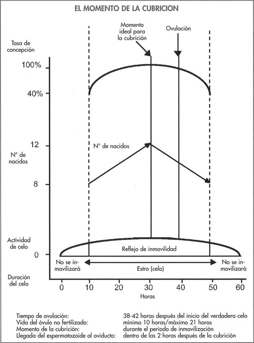 Los espermatozoides tienen que permanecer en la unión uterotubárica alrededor de 6 horas y desarrollarse (capacitación) antes de que sean completamente capaces de fertilizar el óvulo. Dado que el óvulo no fertilizado sólo puede permanecer viable en el oviducto durante 8-1 O horas es importante que la cubrición sea llevada a cabo en el momento correcto, o sea <1 O horas antes de la ovulación (liberación de óvulos). La ovulación tiene lugar cuando han trascurrido dos tercios del período de celo, por lo general alrededor de 40 horas después del inicio de la verdadera salida en celo.