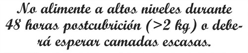 - Aproximadamente 2-3 semanas previas al traslado al área de cubriciones debe realizarse la alimentación ad libitum para maximizar la tasa de ovulación, utilizando una buena dieta para lactantes o de crecimiento con 14 MJ ED/kg y 1 o/o de lisina.