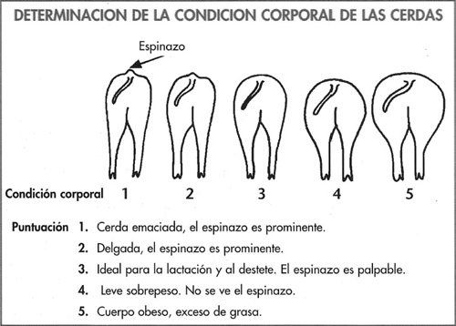 La discusión detallada acerca de la nutrición va más allá del alcance de este libro, pero debe tener en cuenta que lo importante para el control de las enfermedades es la calidad del pienso y la forma en que éste es administrado a los animales. Los aspectos referidos a la nutrición de la cerda lactante se desarrollan dentro del capítulo 8 "Nutrición". El día del destete, antes de sacarla de la instalación de partos, se le debe dar a la cerda 3/4 de la comida de lactación y el resto más tarde ese mismo día. La cerda debe poder comer la misma cantidad de comida que recibió durante la lactación los 3 primeros días posteriores al destete. Esto asegurará que no sufra procesos catabólicos (estado de energía negativa) y una prolongación del intervalo destete-cubrición con la posterior infertilidad. Estas dietas deben contener por lo menos 14 MJ ED/kg, 16% de proteínas y 1-1, 1 % de lisina, especialmente si se está utilizando un genotipo magro. Después de la cubrición, se le debe dar 2 kg de pienso durante 48 a 72 horas y después una alimentación según su condición corporal. Los niveles de energía suministrados no son excesivos en los 3 primeros días después del parto, por lo que es ventajoso utilizar la ración para cerdas gestantes durante 21 días a razón de 3 kg o más por día. Es muy común que en algunas explotaciones se den raciones para cerdas en lactación y raciones para cerdas gestantes. Esta última con una energía digestible entre 13 y 13,6 Mj ED/kg y 1 3 a 14% de proteínas. Es beneficioso que entre el día 3 y el 21 postcubrición se alimente a la cerda según su necesidad ya que de esta forma se verá satisfecha la demanda nutricional para la formación de la placenta. Esto es para granjas en donde tienen lechones con diferentes tamaños y pesos al nacer. El desarrollo de la placenta entre los días 12 a 25 posteriores a la cubrición determinará la calidad del lechón al final de la gestación. Una placenta pequeña llevará a obtener un lechón pequeño. A este respecto, la disponibilidad y la cantidad de pienso ingerido es de suma importancia sobre todo en cerdas alimentadas en grupo. Si hay poco espacio, es muy posible que haya deficiencias nutricionales, en especial en las cerdas menos privilegiadas. Durante la gestación, la cerda no sólo debe ser alimentada según sus requerimientos sino también para satisfacer las demandas producidas por el ambiente en que se encuentran. Estos requerimientos diarios deben ser calculados por el operario. La condición corporal de la cerda se puede determinar por medio de valores numéricos que van de 1 a 5 y para esto se debe apoyar la palma de la mano en la columna por delante de la base de la cola y moverla lateralmente de lado a lado. De esta manera se le puede dar una puntuación a la condición corporal (fig. 7-3). Como guía, las hembras que están próximas al punto del destete deben estar en condición 3. Las hembras más viejas deben llegar a 31/ 2 o 4 en el próximo parto. Las cerdas que estén en 21/ 2 o menos se están acercando a un área de problemas. Si más del 5% de las cerdas poseen una puntuación de 21/ 2 o menos entonces los niveles de alimentación son incorrectos. Si se permite que las hembras lleguen al parto con menos de 3 puntos no van a tener las suficientes reservas de grasa para afrontar la lactación y de ese modo usarán al músculo como fuente de