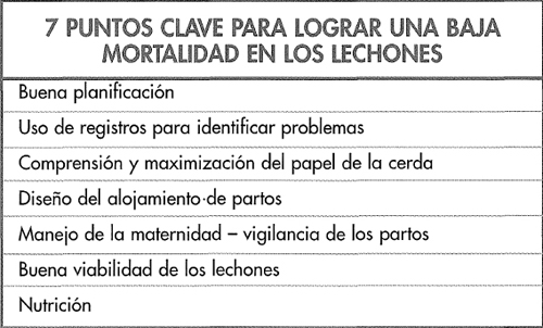 Los alojamientos para partos manejados eficientemente deben alcanzar una mortalidad promedio que va de 5 a 8%. Uno de los objetivos de este capítulo es discutir aquellos factores claves que posibilitan lograr esos objetivos. La figura 8-1 identifica los principales componentes del sistema de manejo que son relevantes para obtener una mortalidad predestete baja. Un requisito importante es contar con un buen sistema de registros para identificar las áreas donde se producen los fallos.Planificación correcta