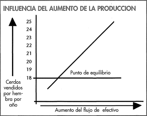 La planificación y el control de los programas de cubriciones, que a la larga dictan los programas de partos, son importantes para el control de las enfermedades ya que determinan los porcentajes dentro de los cuales los animales se puede mover dentro y fuera de las salas de partos y en realidad de toda la instalación. La calidad y capacidad maternal de la cerda y su estado de salud también contribuyen a reducir la mortalidad de los lechones, pero la mayor influencia surge a partir de las técnicas de manejo que se adoptan durante los partos y en las primeras 72 horas posteriores al nacimiento. Un lechón sano y con un buen peso al nacer debe interactuar con un buen ambiente en la sala de partos. Un factor que contribuye a la viabilidad económica del grupo es la de maximizar el número de lechones destetados por hembra por año. "Sin cerdos no se puede vender carne de cerdo" es una declaración pequeña pero apreciada. La figura 8-2 muestra el efecto en el flujo de caja por medio del incremento de lechones por hembra desde 18 a 25 y la mayor parte del rendimiento económico será una ganancia neta debido a que el aumento de animales no es significativo. Los cerdos vendidos por cerda por año multiplicados por su peso cuando dejan la granja determinan los kilos de carne vendidos por hembra por año y el rendimiento económico. Es importante maximizar