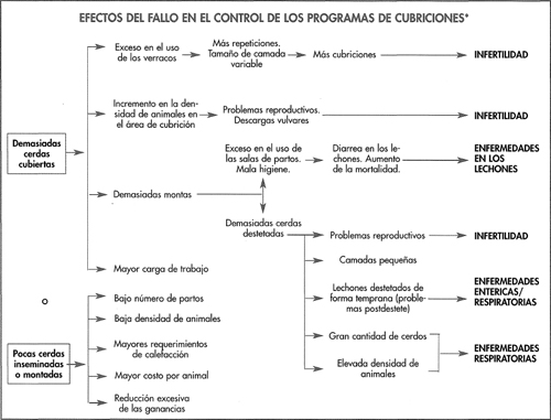 esto alcanzando la máxima eficiencia biológica de la hembra reproductora en la granja. Sin embargo, la sobreproducción iniciada por un aumento de las cubriciones en un período determinado, puede tener un efecto depresor en la salud y el uso eficiente del pienso. El análisis de la figura 8-3 resalta la progresión de los eventos que pueden ocurrir (véase también el cap. 3 Manejo de la cubrición). Observe los efectos ocultos que el uso excesivo de los verracos y el número excesivo de cubriciones tiene en las enfermedades en todo el sistema de producción.