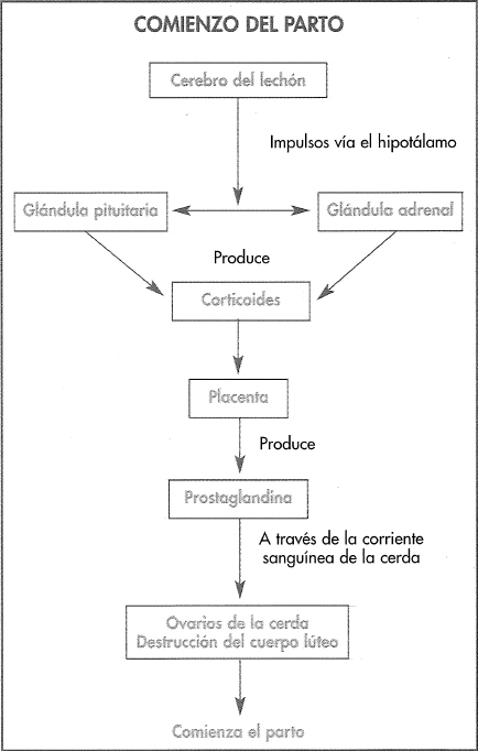 Es un mecanismo intrigante activado por el lechón una vez que alcanza la madurez, aproximadamente a los 115 días de la cubrición. La secuencia de eventos se describe en la figura 8-11 . El lechón pone
