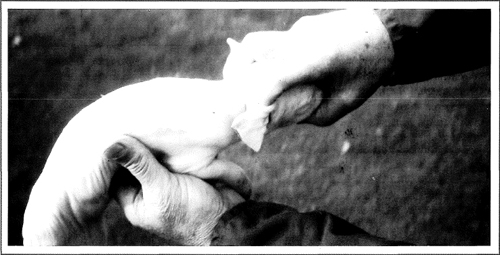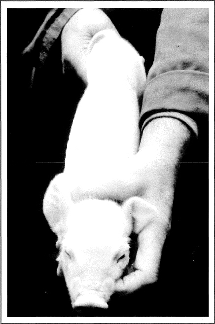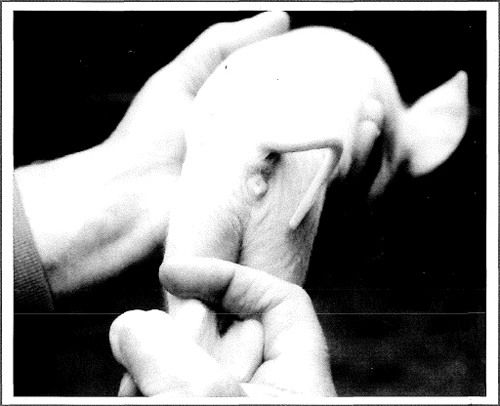 Estimulando al lechón para que respire - Si al nacer el lechón tiene problemas pa" ra respirar, tome una pequeña cantidad de paja y métasela en la nariz. En muchos casos esto logra producir el reflejo de la tos y remover el moco que está bloqueando la tráquea. Otra alternativa es colocar el tercer dedo a través de la boca del lechón con la lengua hacia adelante. Coloque el resto de la mano alrededor de la cabeza y sujete las patas posteriores. Balancee al lechón con movimientos firmes hacia abajo para favorecer la eliminación de moco de la parte posterior de ' la garganta.y de la tráquea (fig. 8-15).