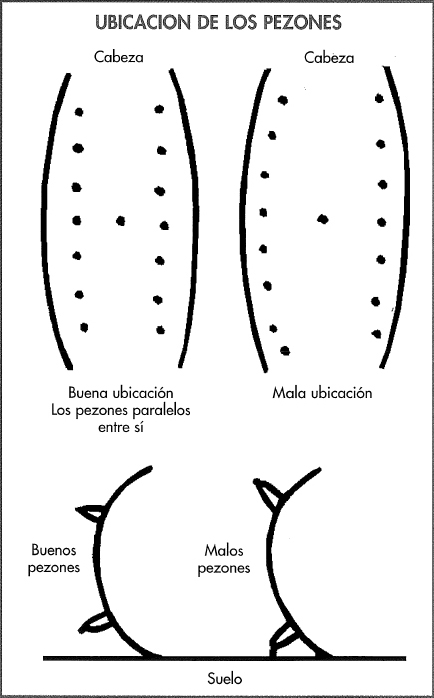 si no tienen un fácil acceso a los lechones. Deben estar separados a igual distancia, sin pezones supernumerarios, ubicados en dos líneas paralelas. Cuando divergen, no son bien presentados a los lechones. Los animales muy corpulentos exageran la ubicación de los pezones (fig. 8-19). La mala conformación del pezón es una de las razones más importantes por las que una cerda no podrá amamantar 11 o 12 lechones. Hay ocasiones en