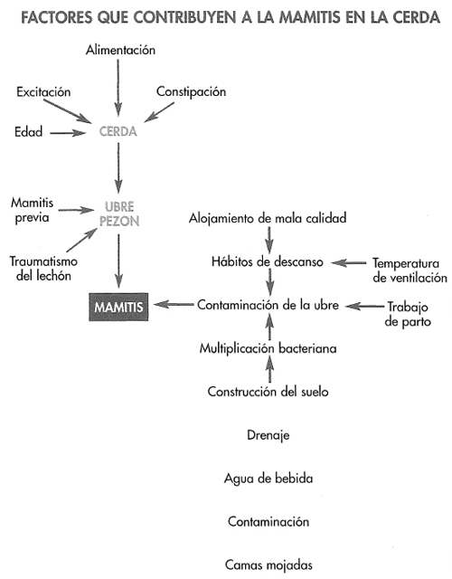 Es la inflamación de una o más glándulas mamarias producida por una variedad de bacterias o secundaria a otras enfermedades. Es una afección que puede ser tanto individual como de la granja asociada a una infección específica. La enfermedad comienza alrededor o durante el parto y se vuelve evidente 12 horas más tarde. Puede surgir como una infección primaria, esto es, por la introducción de las bacterias dentro de las glándulas mamarias por primera vez cerca del parto o puede ser una manifestación súbita de una infección subclínica latente, posiblemente presente en uno o más abscesos pequeños, activados por el desarrollo de la glándula y el chorro de leche. Puede surgir como una secuela del edema de ubre debido a un escaso flujo de leche. Se cree que la vía de entrada de estas bacterias es a través del orificio del pezón o por la inyección de la glándula con los dientes afilados de los lechones. De manera ocasional la mamitis puede surgir a partir de una septicemia. Desgraciadamente, no se ha investigado acerca de la mamitis de la cerda tanto como en el ganado vacuno por lo que el conocimiento de esta enfermedad es empírico y fragmentado. Las bacterias responsables de producir mamitis se pueden agrupar en tres grandes categorías: coliformes, estafilococos y estreptococos y bacterias misceláneas. Hay estudios que demuestran que la mamitis por coliformes es la más común y la más grave, la producida por estafilococos y estreptococos es muy común y en general no tan importante y la producida por bacterias misceláneas es rara y su severidad varía en cada cerda.