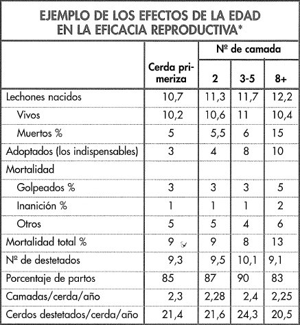 La edad promedio de la explotación es importante en relación con la fertilidad, como se discutió en el capítulo 5 y los mismos comentarios sirven para los rendimientos de la cerda en las salas de partos. La figura 8-9 muestra los resultados esperados en las cerdas primerizas y en las más viejas en cuanto al tamaño de camada, mortalidad y cerdos destetados por hembra por año. Se deben tener en cuenta los porcentajes de nacidos muertos a medida que aumenta la edad de la cerda y la mortalidad de los lechones que a menudo excede el 12% a partir del oc- - tavo ciclo. Además, hay más variabilidad en el peso al nacer y en el tamaño de la camada y hay mayores pérdidas debido a los lechones poco viables. Sin embargo, es posible que haya que retener a las cerdas viejas para mantener el programa de cubriciones y pueden ser útiles para criar al excedente de lechones. Es importante observar que existen cuatro grupos diferentes de hembras reproductoras en la ex-