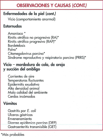 Polvo• Neumonía enzoótica (NE) por micoplasma• Enfermedad de Gléisser (Hps)* Parásitos Síndrome reproductivo y respiratorio porcino (PRRS)* Influenza porcina (IP) Hemorragias: Heces Enteritis aguda Enfermedades clostridiales Ulceras gástricas Hematomas Enteropatía porcina (EP) Disentería porcina Intoxicación con warfarina Hemorragias: Nariz Actinobacillus pfeuropneumoniae (App) Antrax Rinitis Traumatismos Cojera Actinobacillus pfeuropneumoniae (App) Artritis* Enfermedad de los edemas - edema de intestino Mal rojo* Fiebre aftosa (FA) Enfermedad de Gléisser (Hps) Debilidad de los miembros (OCD)* Infección del oído medio Artritis por micoplasma• Infecciones por estreptococos• Traumatismos - músculos, articulaciones, huesos• Mortalidad - Muertes súbitas. Sin signos y más del 1 % Determine la causa por exámenes postmortem Actinobacillus pfeuropneumoniae (App)* Enteritis aguda Antrax Edema de intestino - enfermedad de los edemas Enfermedades clostridiales Enfermedad de Gléisser Enfermedad del corazón de mora (ECM)* Enteropatía porcina (EP) Meningitis por estreptococos (ME)* Torsión intestinal• Traumatismo Mortalidad; todas las causas. Más del 1,5%, incluyendo después de la dolencia Igual que para la muerte súbita anterior Enteritis crónica Pericarditis* Pleuritis Neumonía* Enteropatía porcina (EP)* Traumatismos Vicio {comportamiento anormal) Causas de bienestar Signos nerviosos Abscesos en la columna vertebral Peste porcina africana (PPA) Enfermedad de Aujeszky (EA) - pseudorrabia (PR) Peste porcina clásica (PPC) (cólera del cerdo) Enfermedad de los edemas - edema de intestino Enfermedad de Gléisser (Hps)* Infección del oído medio* Envenenamiento Sa/mone//a choleraesuis |