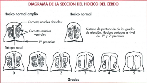 Se basa en los signos clínicos. Sin embargo, el hecho de que se presenten estornudos no necesariamente significa que se trate de una rinitis atrófica progresiva. La enfermedad se identifica fácilmente por los exámenes postmortem de la nariz y el cultivo del organismo a partir de hisopos nasales (consulte el cap. 15 Hisopos). Durante el sacrificio, se secciona el hocico a nivel del segundo premolar y se determina el grado de atrofia de los cornetes nasales. Esto va del O al 5, el O pertenece a un hocico perfecto. El grado 1 muestra una leve pérdida de la simetría de la nariz, el grado 2 una leve pérdida de los tejidos de los cornetes nasales y el grado 3 una cantidad moderada. Sólo cuando se desarrollan los grados 4 y 5, en los que hay una pérdida progresiva de los tejidos, es cuando se debe sospechar de RAP (fig. 9-21 ).