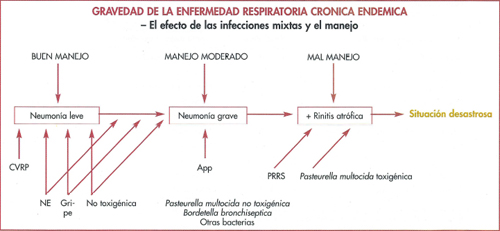 La figura 9-29 muestra los agentes infecciosos que dañan el aparato respiratorio del cerdo y el tipo de enfermedad que producen. La magnitud de la enfermedad depende en parte del número de agentes infecciosos presentes y el peso de la infección a la que se enfrenta el cerdo. CVRP es bastante leve y casi no resulta una infección clínica. PRRS por sí solo tiene pocos efectos clínicos en el aparato respiratorio, pero si se combina con influenza porcina se produce una enfermedad respiratoria grave. En condiciones adecuadas de manejo de la granja la neumonía enzoótica causada sólo por Mycoplasma hyopneumoniae es una enfermedad respiratoria leve, pero si se complica con PRRS, IP o Pasteurella multocida o sus combinaciones, pueden desarrollarse importantes síndromes de enfermedad crónica. De las infecciones bacterianas hay por lo menos 12 serotipos de Actinobacil/us pleuropneumoniae pero la enfermedad depende en parte de la virulencia de la cepa presente; algunas no presentan problemas, otras producen una enfermedad grave. Los serotipos virulentos varían de un país a otro. Las cepas dentro de los serotipos también varían. El síndrome de enfermedad respiratoria crónica se resume en la figura 9-30. Cuanta mayor es la variedad de organismos virulentos dentro de la población de cerdos, más complejo es el cuadro. Resulta útil para investigar un problema determinar cuál de estos organismos está presente.