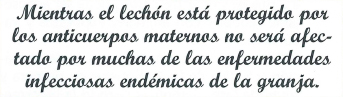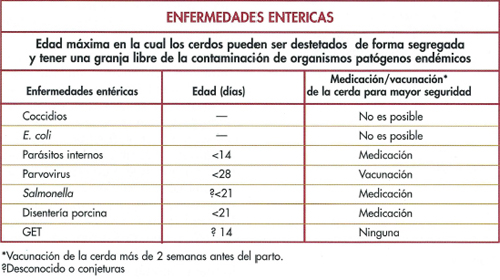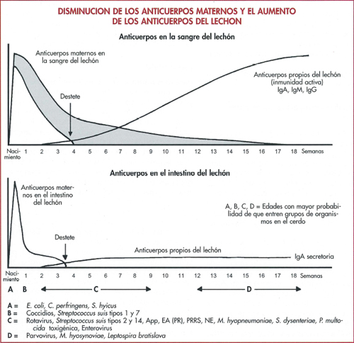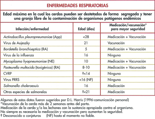 Durante el nacimiento, el lechón recibe anticuerpos e inmunidad a través del calostro. Estos anticuerpos no sólo protegen contra las enfermedades entéricas sino también contra otras enfermedades endémicas en la granja. Estos niveles de inmunidad pasiva o materna llegan al máximo unas horas después del nacimiento y van desapareciendo de forma gradual dentro de las 3 a 14 semanas (fig. 9-31 ). El momento exacto de desaparición difiere entre las enfermedades, una información vital utilizada para el manejo del sistema y control de la enfermedad. Cuando se está investigando un problema respiratorio es fundamental identificar el punto en que aparece la enfermedad por primera vez, porque resalta dónde los cambios de manejo pueden reducir los efectos de la enfermedad. Este hecho biológico puede ser utilizado para controlar no sólo las enfermedades respiratorias sino otras muchas debido a que si el lechón es separado de la cerda después del destete a un ambiente limpio es posible romper el ciclo de la enfermedad. Esto ha sido adoptado como el principio de destete temprano segregado (véase el cap. 3). La figura 9-32 sugiere la edad a la que deben destetarse los lechones para ser enviados a instalaciones aisladas para prevenir que se infecten con diferentes enfermedades respiratorias. Sin embargo, en algunas explotaciones la edad puede ser menor por el tamaño de la